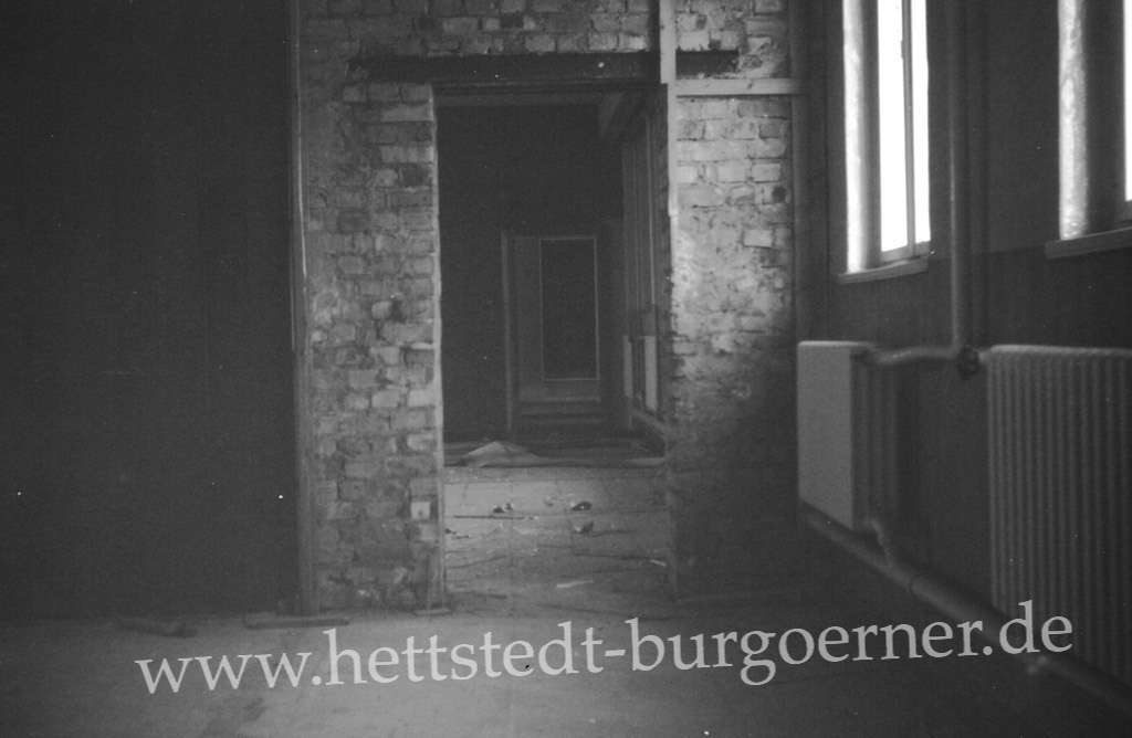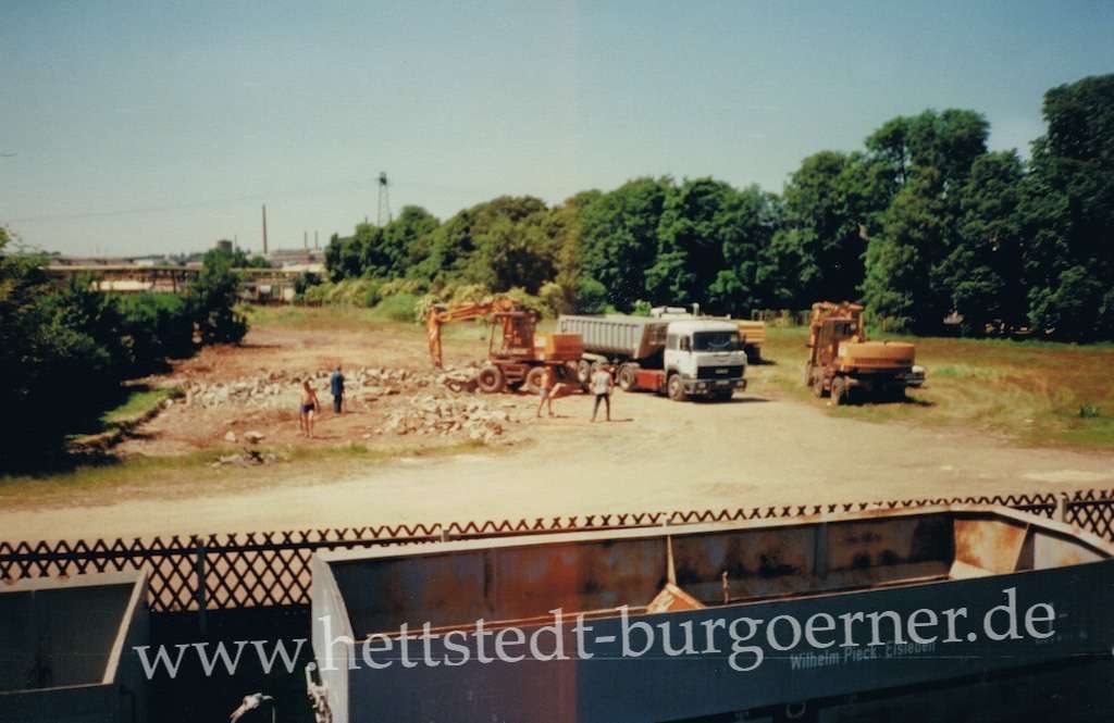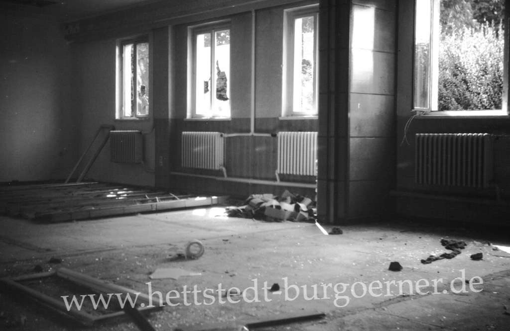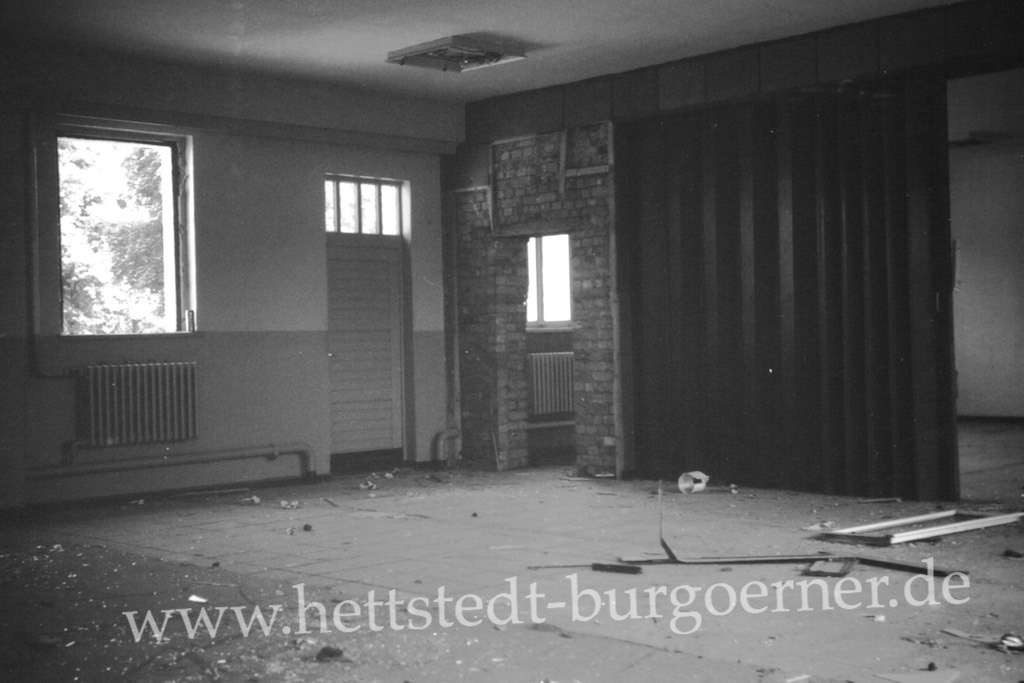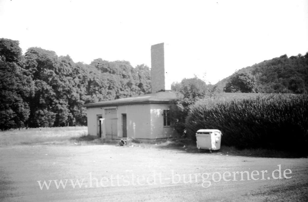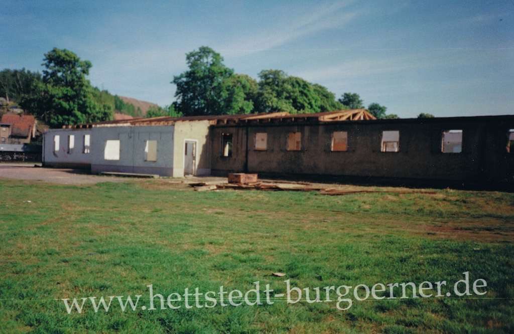 Auf Grund der Luftverschmutzung, man sieht im Hintergrund die absterbenden Bäume, wurde der Sportbetrieb nach Hettstedt verlegt. Die Gaststätte konnte sich nach der Wende mit dem bisher ausreichenden Angebot nicht halten. Dazu kam nun auch die volle Nebenkosten Belastung wie Wasser, Strom und Heizung welches bisher vom Konsum-Verband gemeinschaftlich getragen wurde. Krankheit des bisherigen Wirtes, die allgemeine Mutlosigkeit mit der Sorge um den Arbeitsplatz brachte das Ende dieser bisher sehr beliebten Einrichtung. Eine kurze Zeit des Leerstandes führte zum völligen Ruin und so wurde das Gebäude abgerissen.